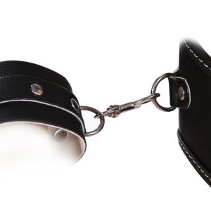 Algemas e Coleira ambas confeccionadas em couro sintético com detalhes em rebite, fivelas para ajuste e corrente em metal, que prende as peças entre si. São adotadas em situações de imobilização para manter os braços e o pescoço da pessoa submissa presos. Descubra novas sensações e possibilidades de mobilidade.
